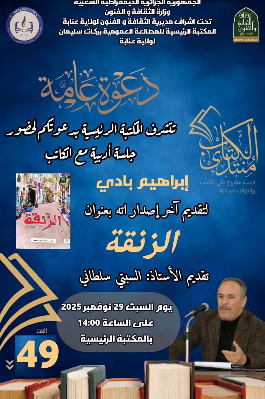 تستعد المكتبة الرئيسية للمطالعة العمومية بركات سليمان بولاية عنابة لاستضافة فعالية أدبية وثقافية بارزة تتمثل في جلسة حوارية مع الكاتب إبراهيم بادي لتقديم ومناقشة إصداره الأخير المعنون “الزنقة”.