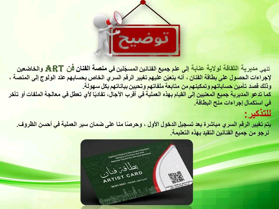 دعت مديرية الثقافة لولاية عنابة جميع الفنانين المسجّلين على منصة “فن “ART إلى ضرورة تغيير الرقم السري الخاص بحساباتهم فور الولوج إلى المنصة، وذلك في إطار تحسين الإجراءات التقنية المتعلقة بإصدار بطاقة الفنان وضمان سير العملية في ظروف آمنة ومنظمة.