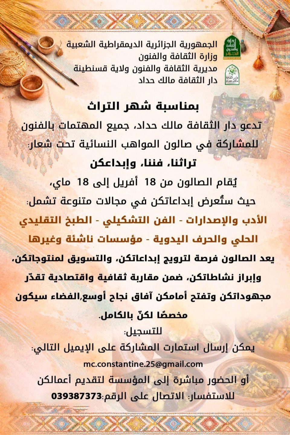 تعلن دار الثقافة مالك حداد، في إطار الاحتفاء بشهر التراث، عن تنظيم تظاهرة ثقافية مميزة تحت عنوان “صالون المواهب النسائية”، وذلك خلال الفترة الممتدة من 18 أفريل إلى 18 ماي 2026، في مبادرة تهدف إلى إبراز الطاقات الإبداعية النسوية ومنحها فضاءً رحبًا للتعبير والتألق.