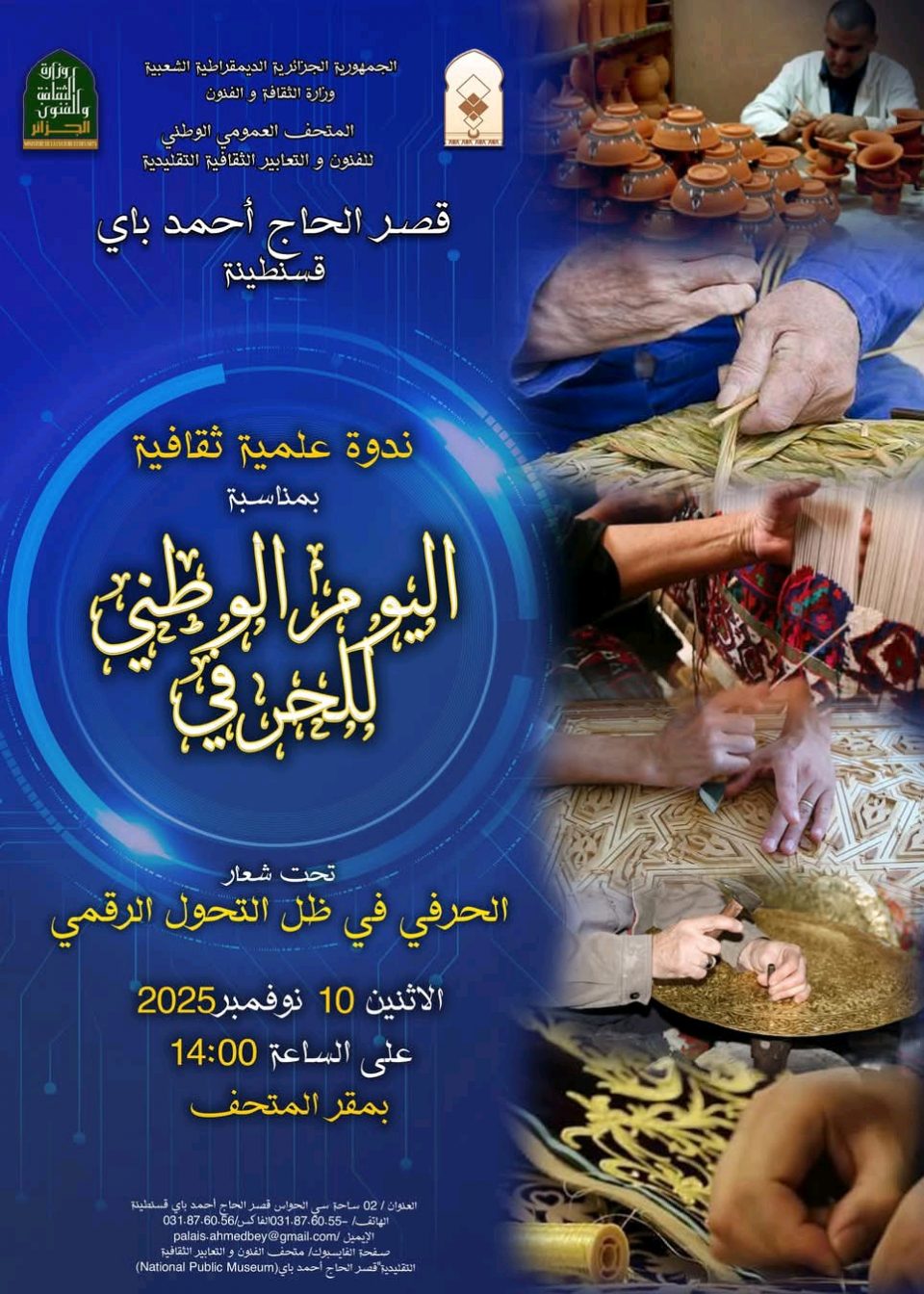 يحتضن قصر الحاج أحمد باي بقسنطينة، التابع للمتحف العمومي الوطني للفنون والتعابير الثقافية التقليدية، اليوم الاثنين، ندوة علمية ثقافية بمناسبة اليوم الوطني للحرفي، تحت شعار “الحرفي في ظل التحول الرقمي”.