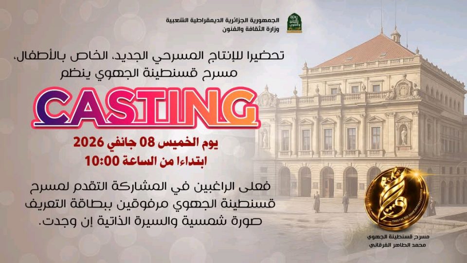ويأتي هذا الكاستينغ في سياق الجهود المبذولة من قبل القطاع الثقافي بقسنطينة، بالتنسيق مع مديرية الثقافة والفنون للولاية، من أجل دعم الإبداع الفني وتشجيع الإنتاجات المسرحية الموجهة للأطفال، باعتبارها رافدًا أساسيًا لبناء ذائقة فنية واعية منذ الصغر.