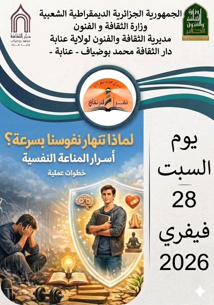 تحتضن دار الثقافة محمد بوضياف، اليوم السبت، تحت إشراف وزارة الثقافة والفنون، وبمتابعة من مديرية الثقافة لولاية عنابة، لقاءً ثقافيًا مميزًا لمناقشة بودكاست بعنوان: “لماذا تنهار نفوسنا بسرعة؟ أسرار المناعة النفسية – خطوات عملية”، وذلك بالتنسيق مع مجموعة “نقرأ لنرتقي”.