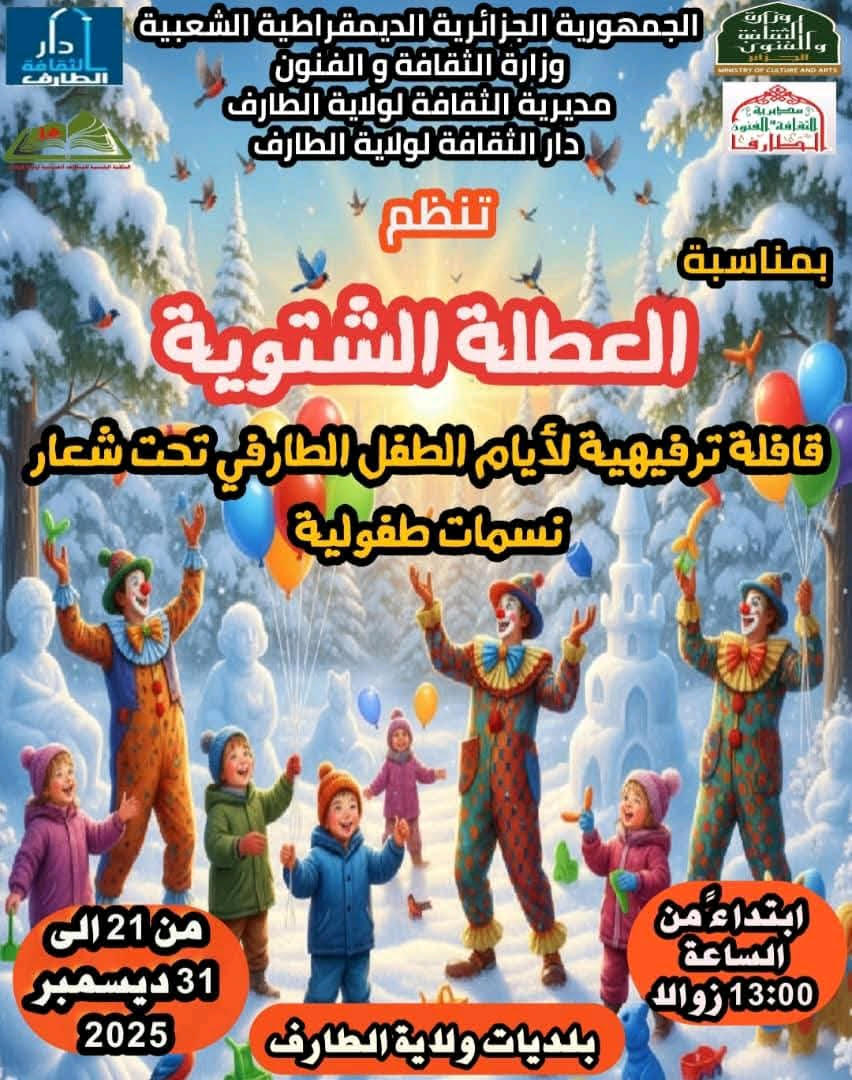 يطلق قطاع الثقافة والفنون لولاية الطارف، تحت إشراف والي الولاية، تظاهرة ثقافية وفنية واسعة النطاق مخصصة للأطفال بمناسبة العطلة الشتوية لعام 2025، حيث سخرت مديرية الثقافة ودار الثقافة والمكتبة الرئيسية كافة إمكانياتها المادية والبشرية لإنجاح هذا البرنامج الذي يمتد من 20 إلى 31 ديسمبر الجاري. وتستهدف هذه المبادرة تنشيط الفضاءات الثقافية وترقية الإبداع لدى الناشئة، من خلال تقديم وجبة دسمة من الأنشطة الهادفة التي تمزج بين المتعة والتعلم في بيئة تربوية محفزة. وتتضمن الفعاليات المسطرة قافلة ترفيهية تجوب مختلف بلديات الولاية تحت شعار “نسمات طفولية”، حيث تنطلق العروض اليومية من الساعة الواحدة زوالا لتشمل الساحات العمومية ومكتبات المطالعة، مقدمةً باقة متنوعة من العروض المسرحية والبهلوانية التي تزرع البهجة في نفوس الصغار. كما يشمل البرنامج فقرات متميزة للحكواتي وألعاب الخفة، إلى جانب تنظيم حملات تحسيسية وورشات تربوية يؤطرها نخبة من الجمعيات والفرق الفنية المحلية، تجسيدا لمبدأ العمل التشاركي الذي يهدف إلى تعزيز المشهد الثقافي المحلي وخدمة الطفولة، وسط دعوات واسعة للأولياء لمرافقة أبنائهم والاستفادة من هذا الزخم الثقافي الذي يحول الفضاءات العمومية إلى منصات للإبداع والترفيه الراقي.