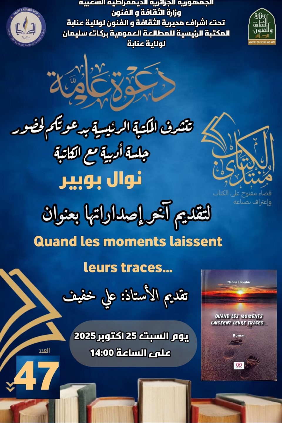 تحتضن المكتبة الرئيسية بركات سليمان بعنابة يوم السبت 25 أكتوبر على الساعة الثانية بعد الزوال (14:00)، لقاءً أدبيًا ضمن منتدى الكتاب في عدده السابع والأربعين، تنظمه مديرية الثقافة والفنون لولاية عنابة وتستضيف خلاله الكاتبة نوال بوبير لتقديم إصدارها الجديد الموسوم بـ “Quand les moments laissent leurs traces”.وسيرافق اللقاء نقاش أدبي يديره الأستاذ علي خفيف، يعقبه جلسة بيع بالتوقيع للكتاب، في أجواء ثقافية مفعمة بالإبداع والتفاعل بين المؤلفة والجمهور. ويأتي هذا الموعد الثقافي ضمن سلسلة اللقاءات التي دأبت المكتبة على تنظيمها، بهدف ترسيخ ثقافة القراءة ودعم الكُتّاب المحليين، إلى جانب تعزيز المشهد الأدبي وإتاحة الفرصة أمام الجمهور للتواصل المباشر مع المبدعين.سلمى حطاب