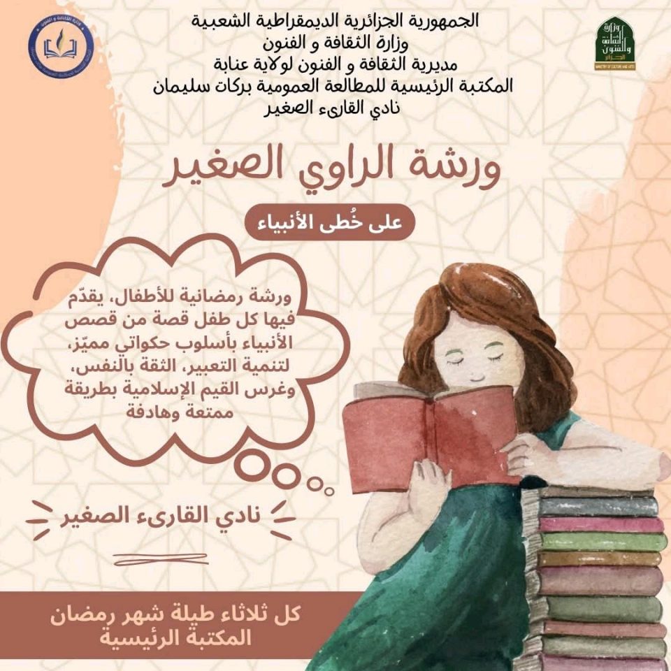 تحتضن المكتبة الرئيسية للمطالعة العمومية بركات سليمان بعنابة، التابعة لمديرية الثقافة والفنون، خلال شهر رمضان المبارك، فعاليات ورشة تربوية موجهة للأطفال تحت عنوان “الراوي الصغير على خطى الأنبياء”، في مبادرة ثقافية تسعى إلى غرس القيم النبيلة وتعزيز مهارات التعبير والسرد لدى الناشئة ضمن أجواء تعليمية ممتعة وهادفة.