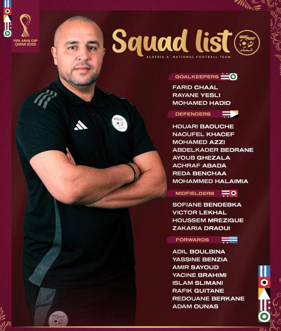 كشف مدرب المنتخب الوطني للمحليين، مجيد بوقرة، أمس الأحد، عن القائمة الرسمية للمنتخب الجزائري المشاركة في بطولة كأس العرب 2025، وهي القائمة التي ضمّت 23 لاعبًا، تم اختيارهم وفق معايير ترتكز على الجاهزية البدنية والخبرة اللازمة لمنافسة من حجم البطولة العربية التي ستُقام بقطر بين 1 و18 ديسمبر المقبل. وجاء إعلان القائمة ليضع حدًا لحالة الترقب التي سادت الأيام الماضية، خاصة في ظل النقاش الكبير حول بعض الأسماء المتوقع حضورها، وأخرى كانت مرشحة للاستبعاد، على غرار عبد الرحيم دغموم الذي غاب عن القائمة النهائية رغم تقديمه مستويات مميزة مؤخرا. اختيارات بوقرة جاءت مزيجًا بين اللاعبين الأكثر جاهزية في الدوريات المحلية والعربية، وبين أصحاب التجربة على الساحة الدولية، وهو ما يفسر إدراج أسماء وازنة مثل ياسين بن زية، أمير سعيود، إسلام سليماني، وياسين براهيمي. الأخير ورغم إصابته الأخيرة مع نادي الغرافة وغيابه عن المنافسة لمدة أسبوعين، فضل الطاقم الفني الاحتفاظ به ضمن المجموعة، مع إمكانية استبداله قبل المباراة الأولى في حال عدم تعافيه الكامل، في خطوة تؤكد الدور المنتظر من اللاعب داخل المجموعة سواء داخل الملعب أو خارجه.