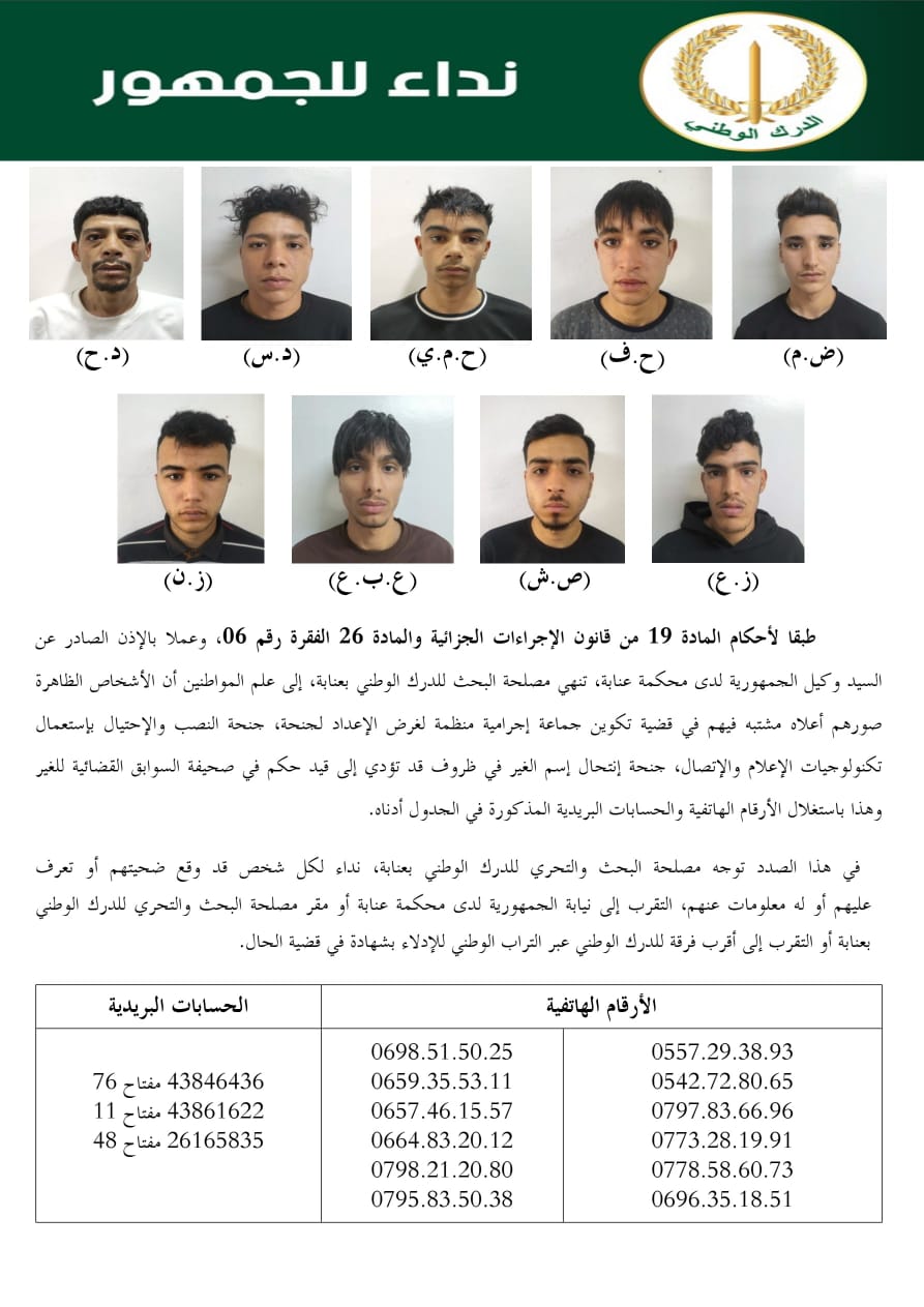 وأوضح البيان أن هذا الإجراء جاء طبقًا لأحكام المادة 19 من قانون الإجراءات الجزائية والمادة 26 الفقرة 06، وبإذن صادر عن وكيل الجمهورية لدى محكمة عنابة، حيث تم نشر صور أشخاص مشتبه فيهم يُرجح تورطهم في القضية المذكورة، مع استعمال هويات مزورة وانتحال أسماء الغير في ظروف من شأنها أن تؤدي إلى قيد أحكام في صحيفة السوابق القضائية لغير أصحابها. وأشار المصدر ذاته إلى أن المشتبه فيهم قاموا باستغلال أرقام هاتفية وحسابات بريدية متعددة، استُعملت في تنفيذ الأفعال الإجرامية محل المتابعة القضائية، وهي الأرقام والحسابات التي تم إدراجها ضمن النداء لتسهيل عملية التعرف عليهم أو الحصول على معلومات قد تؤدي إلى توقيفهم. وفي هذا السياق، دعت مصلحة البحث والتحري للدرك الوطني بعنابة كل شخص يعرف المشتبه فيهم أو لديه أي معلومات بشأنهم أو بشأن تحركاتهم إلى التقرب في أقرب الآجال من نيابة الجمهورية لدى محكمة عنابة، أو التوجه إلى مقر مصلحة البحث والتحري للدرك الوطني بعنابة، أو إلى أقرب فرقة للدرك الوطني عبر التراب الوطني، من أجل الإدلاء بشهادته في هذه القضية. وأكدت المصالح المختصة أن التعاون مع المواطنين يبقى عنصرًا أساسيًا في مكافحة الجريمة، مشددة على أن جميع المعلومات المقدمة سيتم التعامل معها في إطار السرية التامة ووفقًا لما ينص عليه القانون.