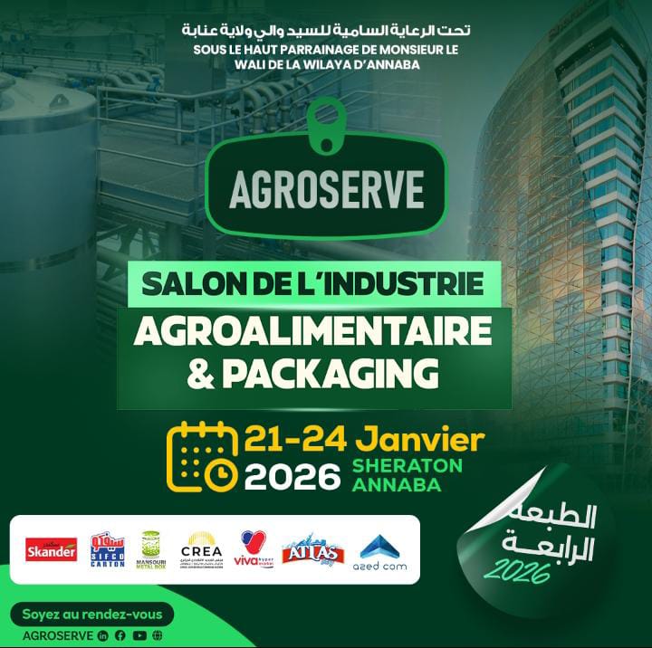 تنظم شركة AZEDCOM اليوم الندوة الصحفية الرسمية للطبعة الرابعة من معرض 2026 AGROSERVE EXPOاليوم بداية من 10:00 صباحا سيحضر المؤتمر رئيس غرفة التجارة والصناعة سيبوس بالإضافة إلى منظم المعرض، وستتناول فعاليات المؤتمر، تقديم التوجهات الكبرى للطبعة الرابعة من 2026 AGROSERVE EXPO ، مناقشة فرص وتحديات قطاع الصناعات الغذائية والتغليف في الجزائر، إبراز الأبعاد الاقتصادية، المؤسسية والدولية للمعرض، وسيقام المعرض من 21 إلى 24 جانفي 2026 في فندق شيراتون عنابة تحت الرعاية السامية لوالي ولاية عنابة، وسيجمع الصناعيين والمستثمرين والشركاء والمؤسسات الوطنية والدولية، مع التركيز على تعزيز الصادرات الوطنية وتحسين توزيع المنتجات الغذائية في المنطقة قبل الشهر الفضيل، تقديم سلسلة ورشات عمل (Workshops) متخصصة وفرص للتواصل وعقد شراكات تجارية (B2B) ذات قيمة مضافة.