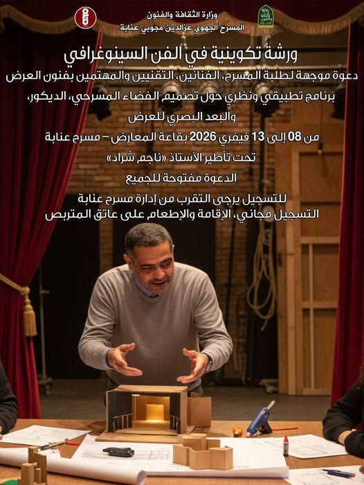 كما أعلن المسرح الجهوي بعنابة، عن فتح المجال للشغوفين بالموسيقى التصويرية وفنون العرض، حيث دعاهم للمشاركة في برنامج تكويني مميز يجمع بين الجانب النظري والتطبيقي في الموسيقى التصويرية وفنون العرض الحي، خلال الفترة ما بين 7 إلى 13 فيفري المقبل، بفضاءات مسرح عنابة. وتقام تحت تأطير الأستاذ عبد القادر صوفي، كفرصة حقيقية لاكتساب مهارات فنية، وصقل المواهب، والاحتكاك المباشر، بتجربة فنية احترافية داخل فضاء المسرح، في حين تظل الدعوة مفتوحة للجميع، للتسجيل والاستفسار، على أن يكون التسجيل مجاني، أمام الراغبين في المشاركة.