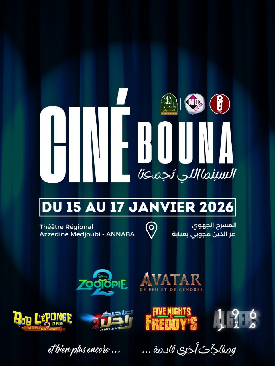 وسيتم عرض أيضا يوم الجمعة 16 جانفي الفيلم الكرتوني “Bob l’éponge” وأفلام “”غرين لاند”، “رقية والفيلم التونسي الشهير “صاحبك راجل 2″، أما يوم السبت فسيتم عرض الفيلم الكرتوني “زوتوبي 2” وأفلام “انكوندا” وفيلم “196 متر” من بطولة النجم الجزائري نبيل عسلي والمتوج بالعديد من الجوائز الدولية وفيلم “بعد 28 سنة”.